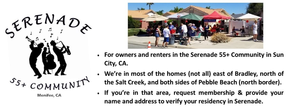 To chat with your neighbors about Serenade events, go to either the Facebook or NextDoor groups that a few of us have created. Both are “closed” groups, available only to people who live within our Serenade boundaries (described on the HOME page here). Both owners and renters are welcome! To be admitted to either group you will be required to provide your name and address to the group administrator – Brian Engelhardt on NextDoor; Jane DeLaurier on Facebook. In Facebook, go to this link: Serenade 55+ Community – Sun City, CA. For the NextDoor group, go to this link: https://nextdoor.com/g/stt1aoghi/?is=feed_nudge_post.