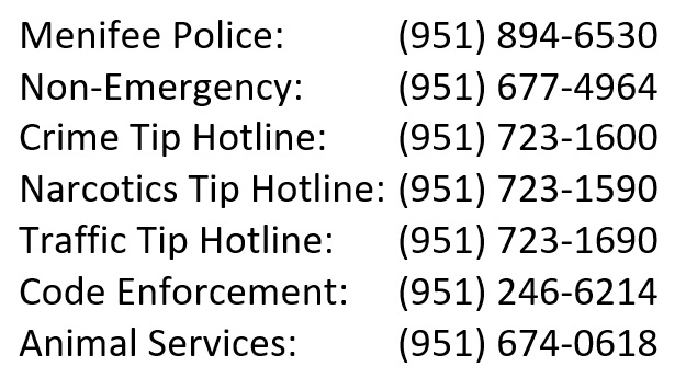 We are unique in many ways. The community’s newsletter is delivered to our doors four times a year. This website allows our residents access to regular information about the neighborhood — especially through our own online bulletin board. We gather together often for block parties, neighborhood clubs, and holiday celebrations. Most of our streets are so wide and quiet and untraveled that our visiting grandchildren can skate down the middle of them. Our 314 homes are some of the loveliest and safest in Menifee.